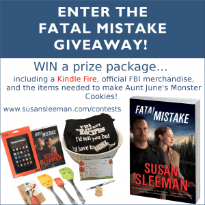 I’m thrilled to offer exciting prizes for the release of Fatal Mistake, my first book in the White Knight’s Series and wanted to share them with The Suspense Zone viewers* as well as on my website. I have six contests planned that will span two months time. First up is a gift basket that includes Fatal Mistake, a Kindle Fire, and all the utensils you’ll need to make Aunt June’s monster cookies featured in the book including a hand written recipe from me!